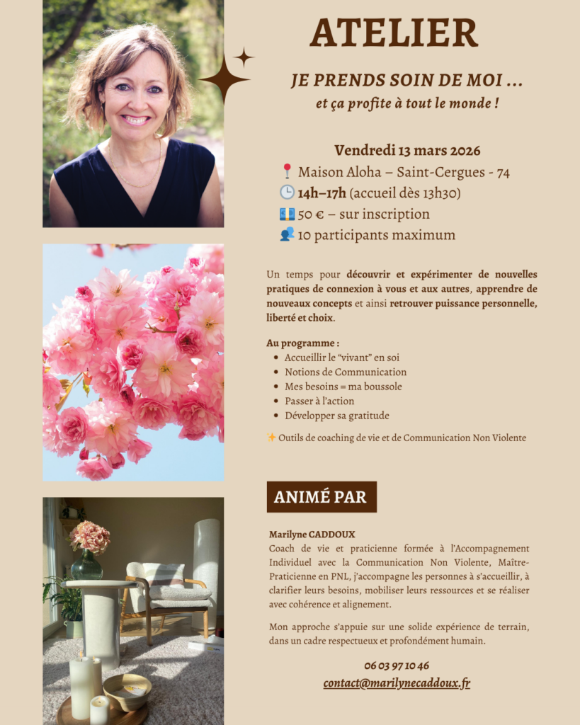 C’est un espace ressource pour oser expérimenter et incarner ce que nous souhaitons vivre au travers de la CNV : retrouver du pouvoir dans nos vies et relations, pratiquer l’auto-empathie et l’empathie, la célébration et surtout se lancer dans l’expression authentique !