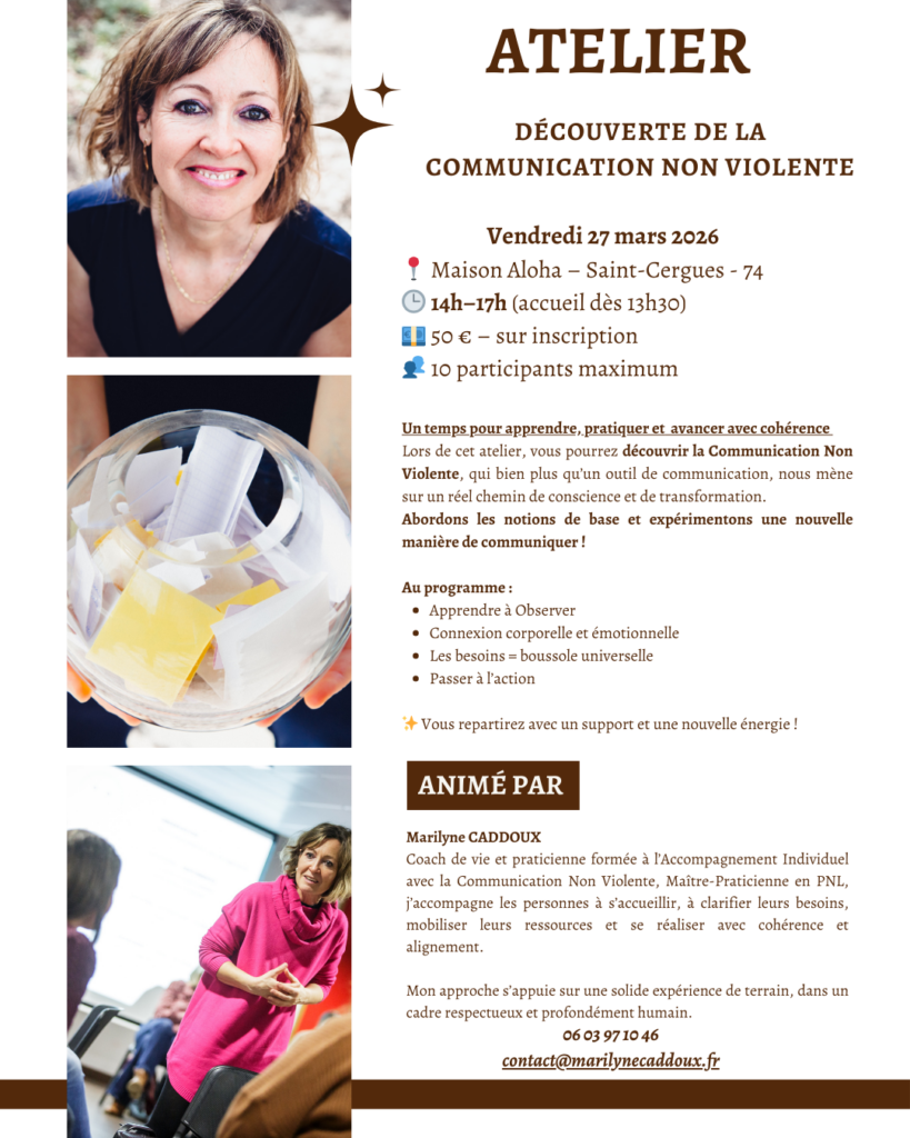 Mon approche avec la Communication Non Violente, permettra de vous accompagner à sortir, petit à petit, du schéma habituel et conditionné de nos pensées, jugements, déni de responsabilité et à les traduire en sentiments et besoins.